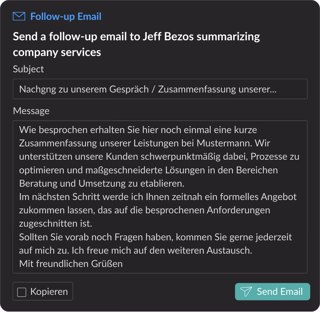 Wenn Zusammenfassungen, Aufgaben und Angebote manuell erstellt werden müssen, geht wertvolle Dynamik zwischen dem Meeting und dem nächsten Schritt verloren.
